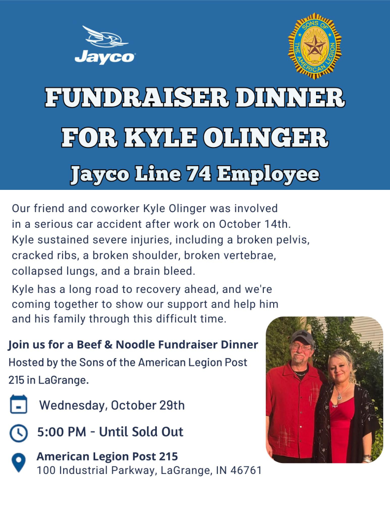 The Post 215 family, along with Kyles family and coworkers invite you to help out by joining us for a benefit beef and noodles dinner on Wednesday, October 29th, from 5:00 pm until sold out. This will be a “by donation” event.